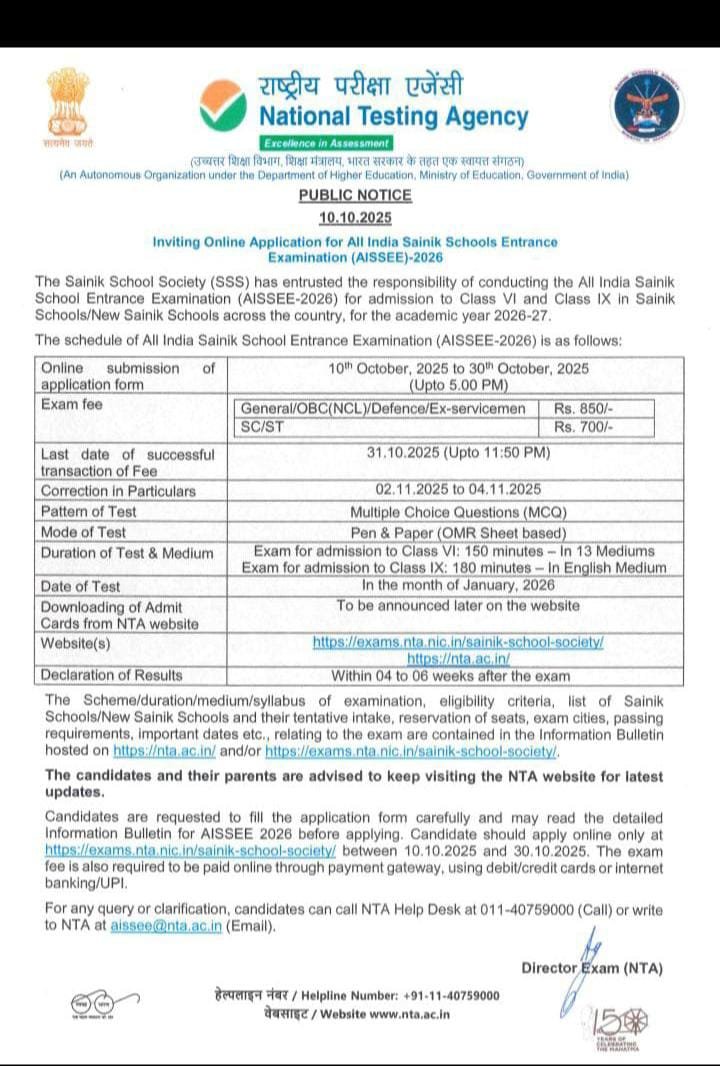 The National Testing Agency (NTA) has officially released the Sainik School Admission Form 2026 for Class 6 and Class 9. The All India Sainik School Entrance Examination (AISSEE-2026) is now open for online applications.